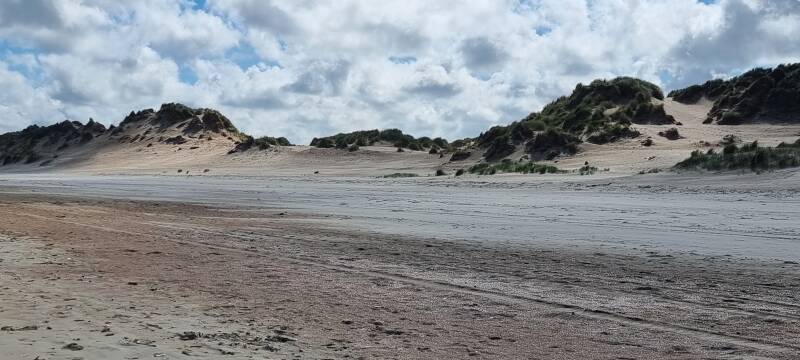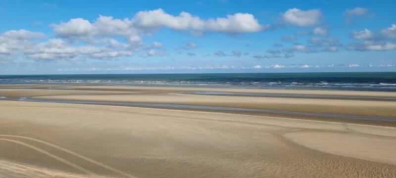 Een stukje betonbaan, een voetpad door de duinen en dan, niet te beschrijven en adembenemend mooi: dat eerste zicht op het (compleet) verlaten strand, de terugtrekkende zee die getijdenpoeltjes en waterstroompjes achterlaat, de witte kraagjes van de golven, het alle-tinten-blauwe water en de ijle bewolkte lucht erboven. Dat unieke 180 graden lege landschap, zonder begin of einde … we worden er eerbiedig stil van!