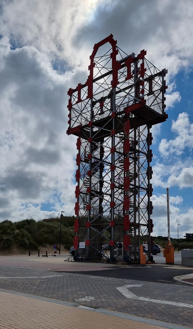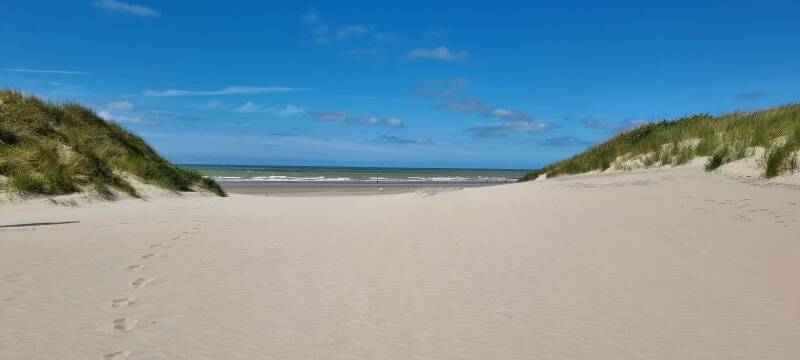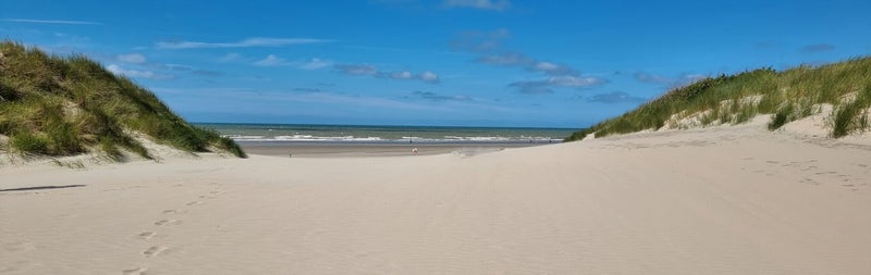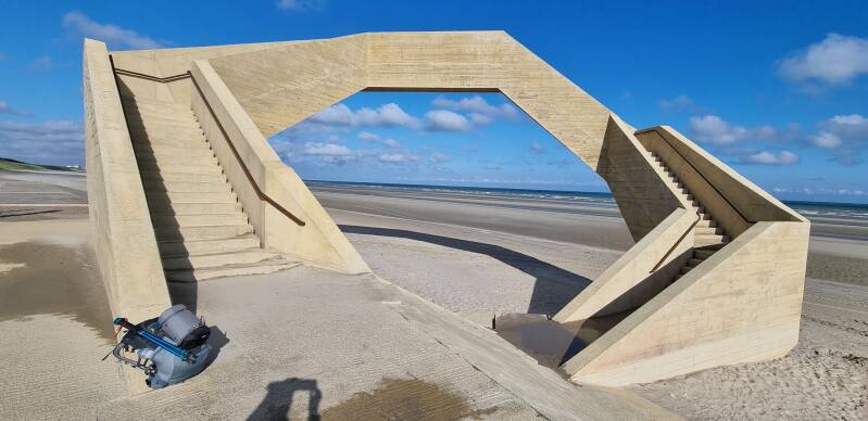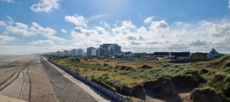 Ons echte wandelbeginpunt ligt een paar honderd meter verder, richting Frankrijk: het Westerpunt. Een niet te missen, opvallend knappe betonnen constructie die, als een zwevende trap, strand en lucht en zee met elkaar verbindt. Trede per trede de hoogte in word je beloond met een fantastisch uitzicht over de omgeving. Die paar extra stappen dik waard!
