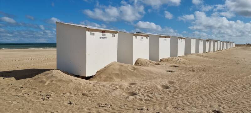 Een lange rij witte strandhuisjes, een stukje nostalgie, roept herinneringen op aan lang geleden uitstapjes aan zee, aan emmertjes en schepjes en zandkastelen, aan smeltende ijsjes en plakkerige boules de Berlin.