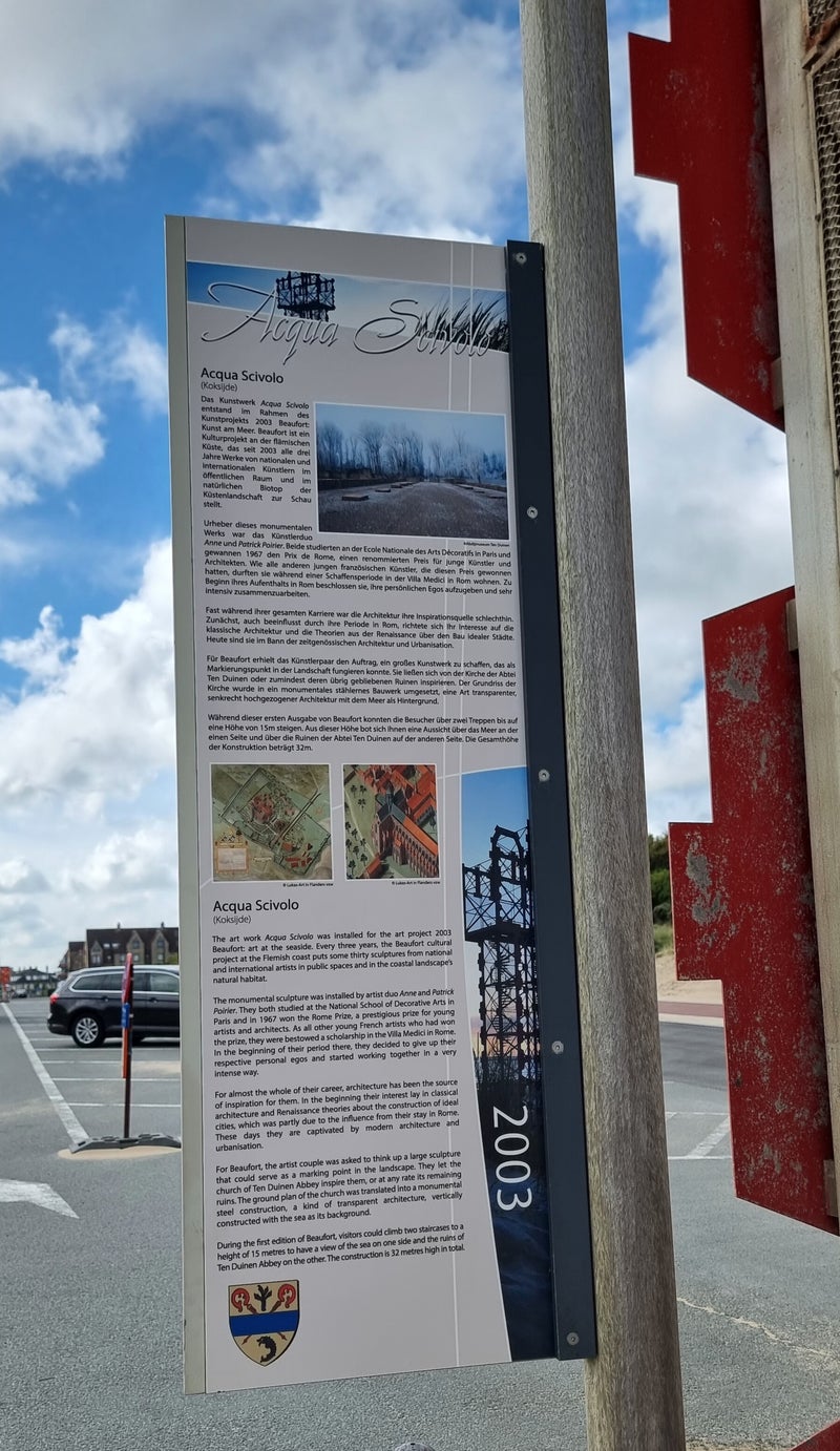 We ruilen het zand voor een stukje Zeedijk en dat doet deugd aan de voeten. Aan knooppunt 46 is een bankje een welkome stop voor een snack en een drankje. Achter ons een merkwaardig monument? klimtoren? bizarre toegang tot een parking? Niks van dat alles. Ook deze creatie met de mooie naam Aqua Scivolo of waterglijbaan behoort tot de permanente collectie van het kunstfestival Beaufort dat elke 3 jaar naar de kust komt. Het infobord meldt dat de kunstenaars het idee voor hun installatie vonden in de ruïnes van de vroegere Abdij van Onze-Lieve-Vrouw Ten Duinen. Die archeologische site ligt op amper 1 km van het strand en de dijk van Koksijde. Het grondplan van de vroegere abdijkerk werd in een doorzichtige stalen vorm gegoten en rechtop gezet. Een eerbetoon aan een van de grootste en invloedrijkste abdijen van Vlaanderen in de 12e eeuw.