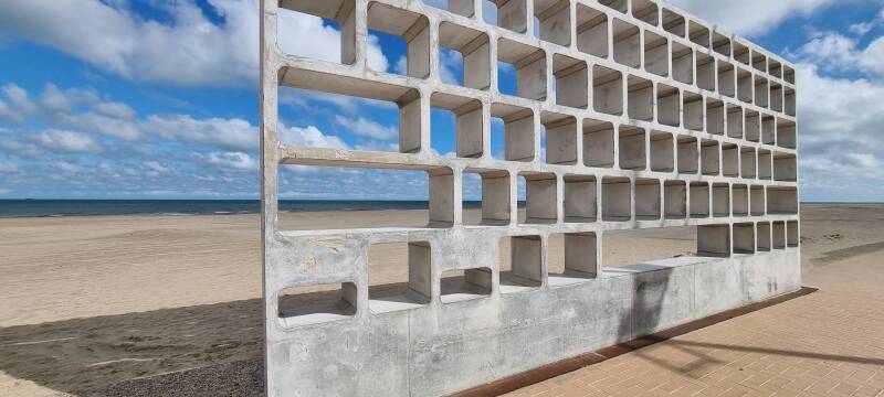 Omdat het zo prettig stapt en de wind een stuk minder voelbaar is, blijven we een tijdje op de Zeedijk. En daar is het volgende Beaufortwerk al. We kijken naar een wonderlijk betonrooster met kleine en grotere vakjes. Wat is/was de bedoeling van de kunstenaar? Een open raam naar de zee aan de ene kant, een zicht op de appartementsgebouwen aan de andere kant? We snappen met geen mogelijkheid wat deze abstracte schepping moet voorstellen! Enig opzoekwerk leert ons dat het een toetsenbord zonder toetsen symboliseert met de sprekende naam All the words in the world. Wij zien geen woorden maar beelden als in een ouderwetse viewmaster.