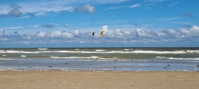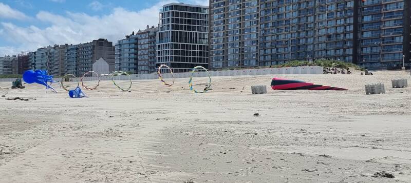 Daar dient de volgende kustgemeente zich al aan met een speelse verzameling hoepels, vliegers en een felblauwe opblaasinktvis, een knipoog naar de strandspeeltjes van vroeger en nu. Minder leuk: de natuur is hier de verliezende partij en waar ooit de fraaie duinen het landschap bepaalden kijken we nu naar een ellenlang snoer van kustappartementen. Aan de linkerkant wordt ons zicht op zee door niks verstoord. En dat is genieten, met de wind in ons haar en de ruisende golven in onze oren. Uitwaaien noemen ze dat! Een instant vakantiegevoel noem ik dat!