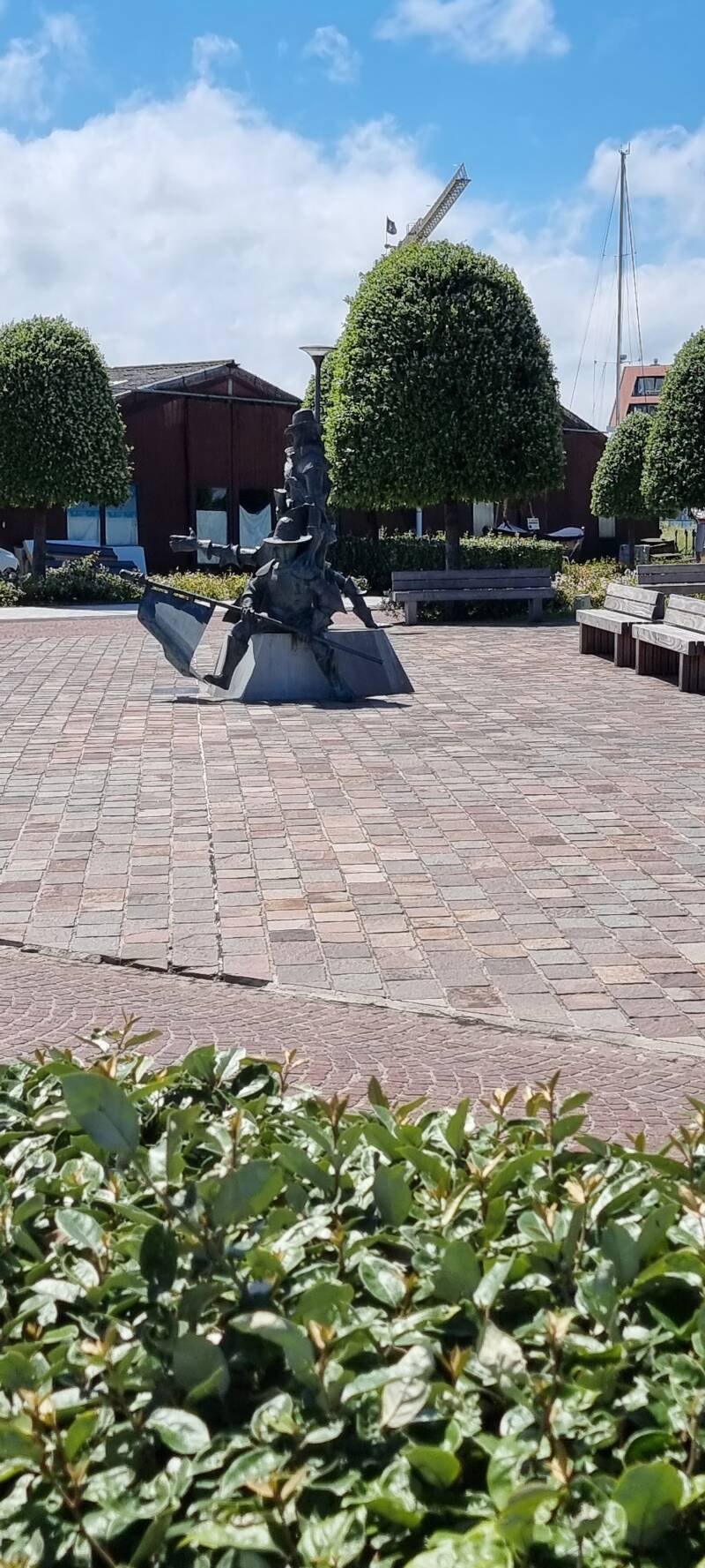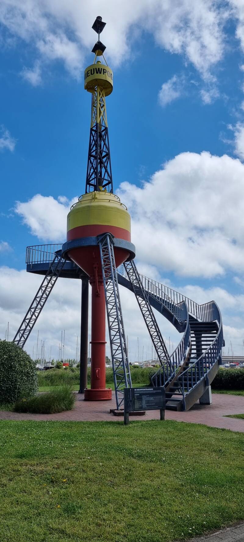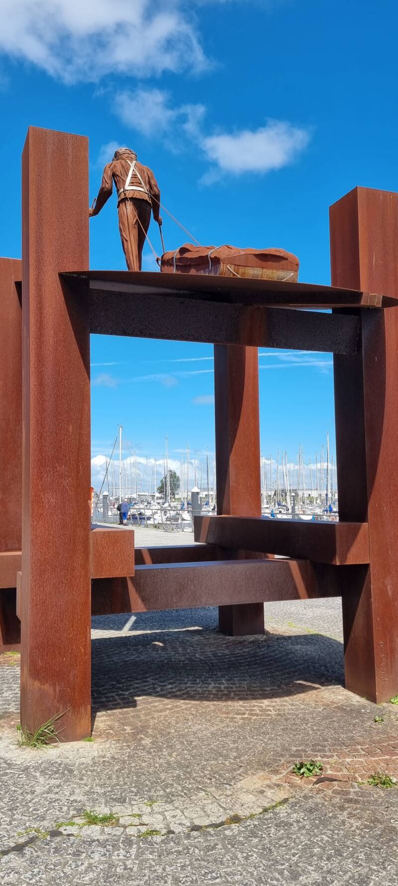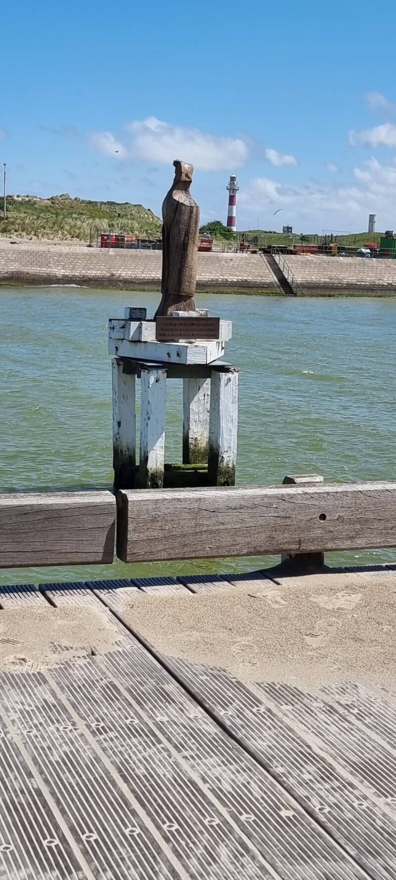 Een houten beeldhouwwerk op een paal in de vaargeul verwijst naar het 19e-eeuwse studentenlied van Rodenbach: 'Vliegt de Blauwvoet? Storm op zee'.