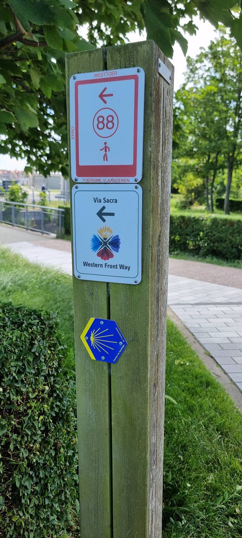 Knooppunten volgen heeft geen zin meer, ons lijstje is in de war nu we de veerboot niet namen. De laatste 3,5 km volgen we simpelweg de Kustweg en dan een paar keer rechts, een paar keer links, langs de dorpsstraatjes van Lombardsijde om tenslotte te eindigen aan de achterkant van onze logeerplek: Kompas Camping Westende. De echte ingang bevindt zich 400 meter verder maar na 21 km stappen zijn bordjes lezen blijkbaar een ingewikkeld iets.
