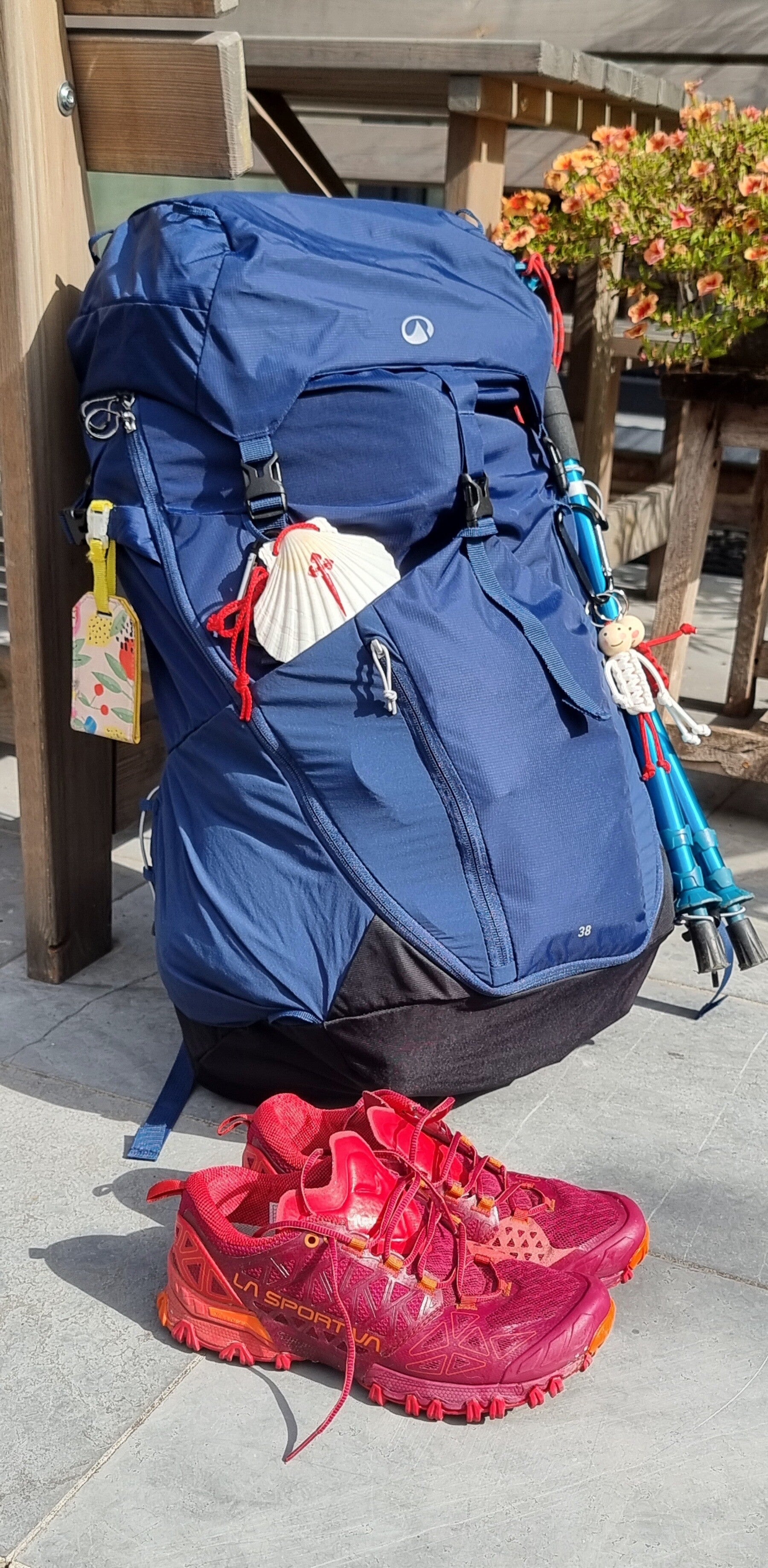 - Pak licht in: Onmisbaar zijn een goed passende rugzak, een waterdichte jas, comfortabele wandelschoenen, een warme trui, lichte en sneldrogende wandelkleding, goede wandelsokken, een waterzak en snacks voor de eerste dagen, toilet- en EHBO-spullen (kleine verpakkingen) … en vergeet ook de oplader voor je telefoon niet! Nog een goeie: maak een inpaklijst en weeg je spullen zodat je weet welk gewicht je meesleurt. Meer inpaktips lees je in deze onderweg-blog en eveneens in deze.
