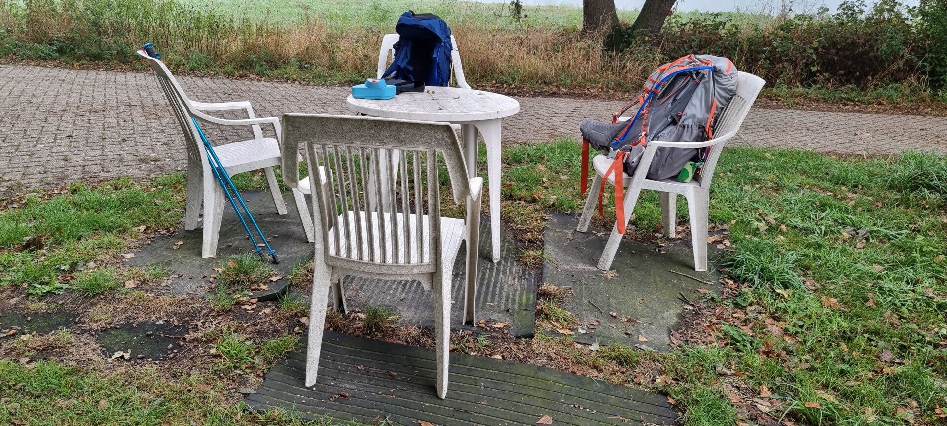 Uitgestrekte boerenbedrijven liggen als edele parels aan brede opritten, omringd door groene houtwallen en vaak wordt er aan de wandelende pieterpadder gedacht met een bankje of een bizar setje van 4 witte plastic stoelen en een tafel, in het gezelschap van een poëtisch gedicht … zomaar langs de kant van de weg.