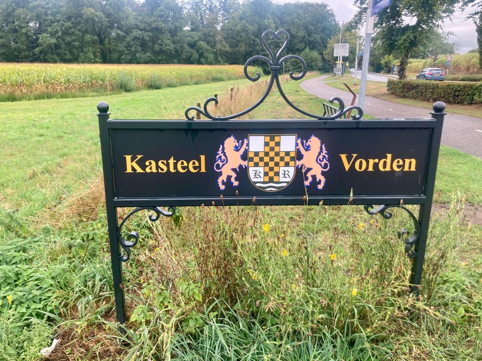 We lopen het dorpscentrum uit, voorbij het bordje ‘historische buitenplaats’. De wit-rode streepjes zijn een zorg voor morgen. Vandaag volgen we een lange oprijlaan tussen groene weiden. Oude kasseitjes en antieke lantaarnpalen zorgen voor een romantisch decor, aan de horizon een glimp van een slanke middentoren en een ‘Vlaamse’ trapgevel. Het Kasteel Vorden staat al sinds de 12e eeuw mooi te wezen in het typische landschap van de Achterhoek. Een slotgracht met een houten toegangsbrug, een paar stoere mythische wachters, hoge smalle ramen in een maïsgele omkadering, zwarte vensterluiken, een weelderige parktuin, bospaadjes die ons meenemen langs raar gevormde paddenstoelen, een bizar dikke stokoude linde waaronder Lodewijk XIV nog heeft geslapen, en een 19e-eeuwse bosloods die omgetoverd werd tot eet- en drinkplek … we zijn ferm aan ‘t genieten!