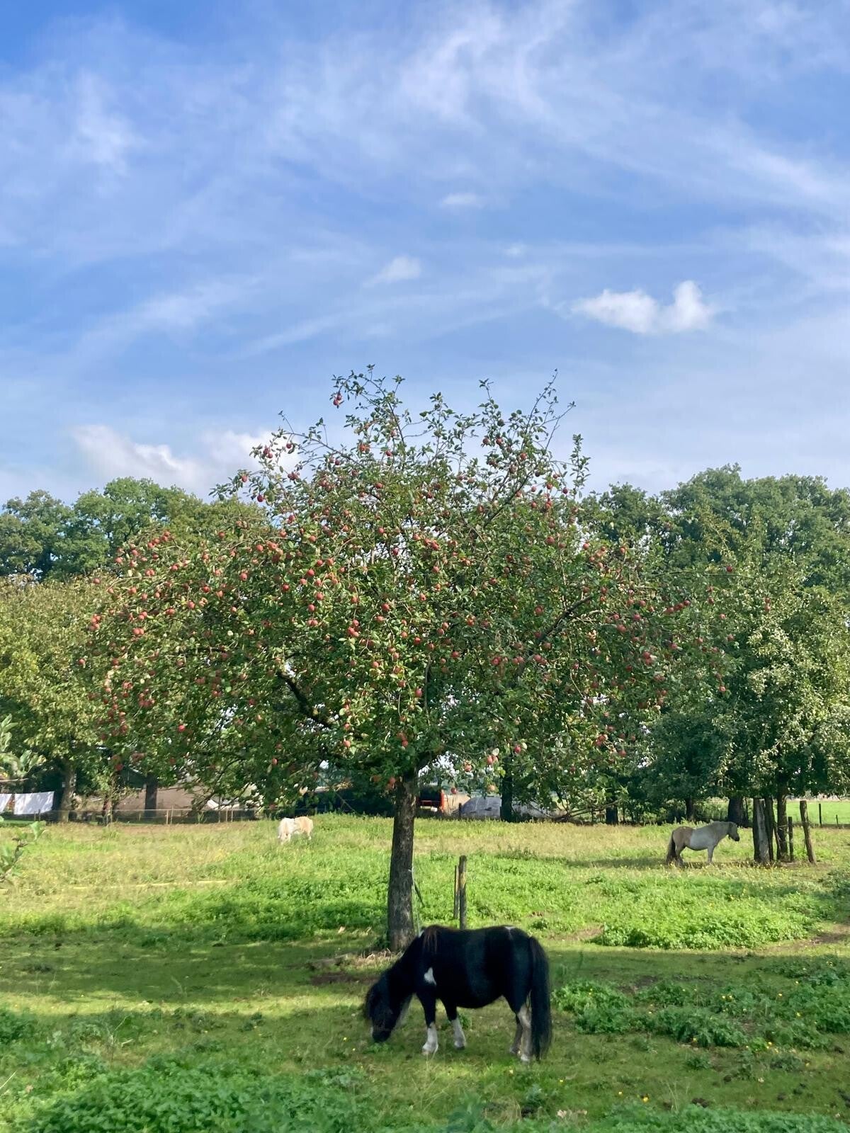 Uit het bos maken de bomen aan de linkerkant plaats voor akkers en grasland en is de bewoonde wereld ineens heel dichtbij in de vorm van een drukke verkeersweg. Gelukkig mogen wij de zandweg aan de overkant op om even later te merken dat het Pieterpad hier verdergaat over het erf van een boerderij, voorbij de tractors en de maaimachines en de pony’s onder de appelbomen.