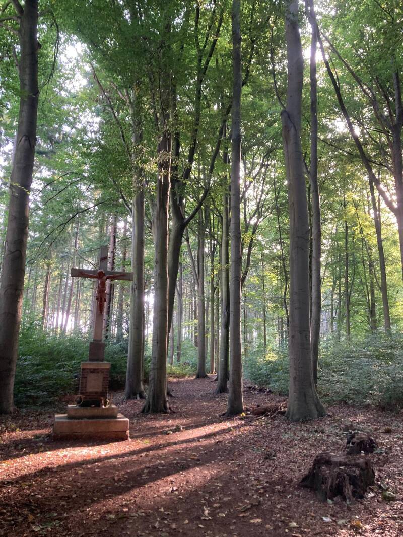 Een houten poort geeft toegang tot een lange dreef met hoge beuken. Het Pieterpad voert ons dwars door het Hillenraedts bosgebied, langs rechte paden waar ooit vossenjachten werden gehouden. Geen jagers of vossen te bespeuren vandaag, wel een vreemde verschijning in de vorm van een stenen wegkruis met bronzen Jezus gevat in een zonnestraal. Oh ja en vreemde paddenstoelen als vliegende schotels met decoratieve witte rand, die komen we ook tegen.