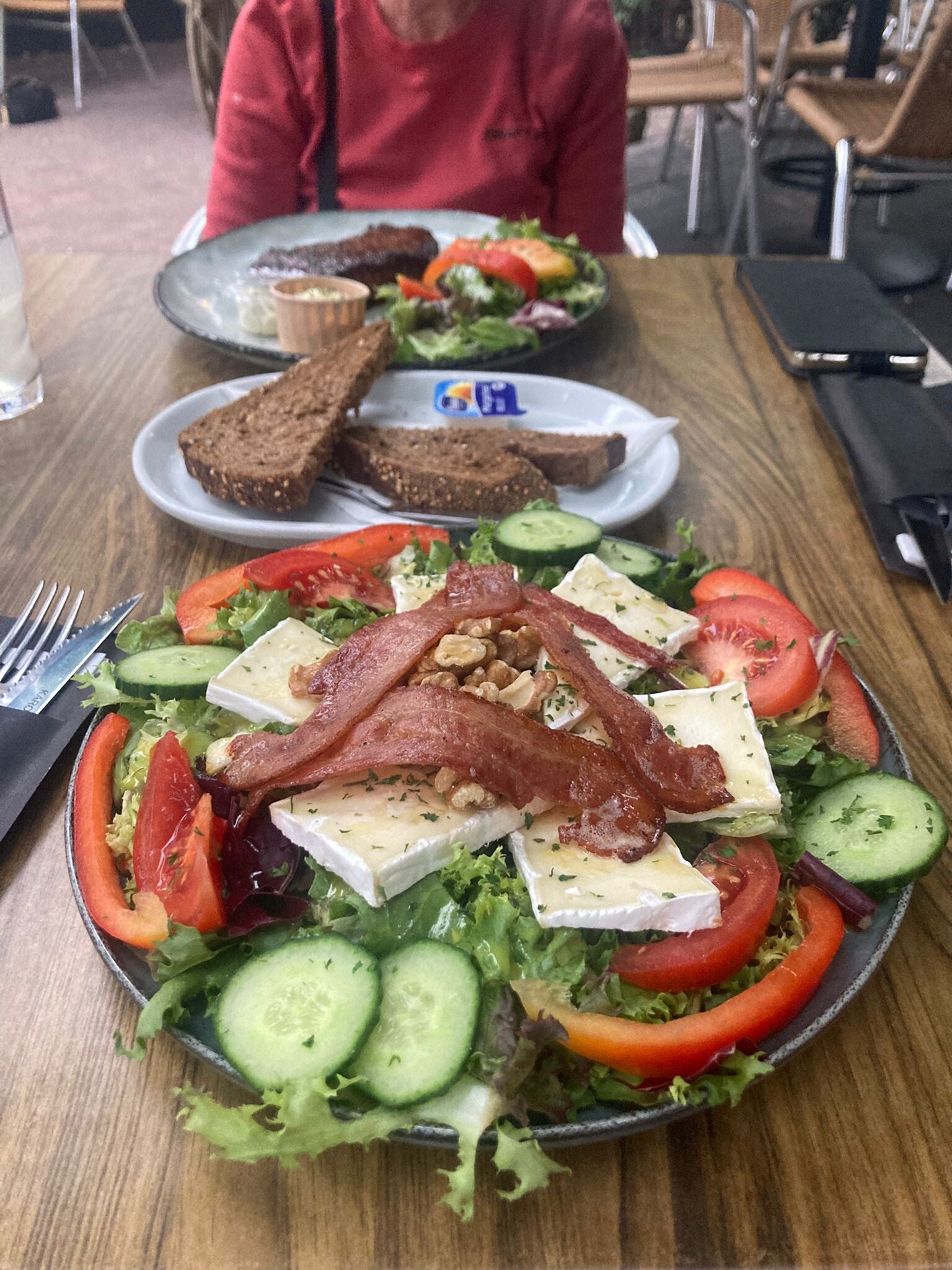 Voor het avondeten trekken we naar het dorpscentrum, naar café ‘Biej De Vogel’ op aanraden van onze B&B gastvrouw. En daar op het terras zien we meneer en mevrouw Pieterpad van deze ochtend terug. Er wordt gewuifd en dag gezegd en dan genieten we van een overvloedige salade en een deugddoende steak met frietjes om de dag mee af te sluiten.