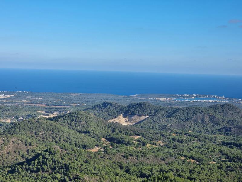 Beneden ons, als speelgoedblokjes zo klein, zien we dorpen en een kuststadje, bossen en vlakke akkers, een jachthaven, de zee en heel in de verte ook het onbewoonde eiland Cabrera.